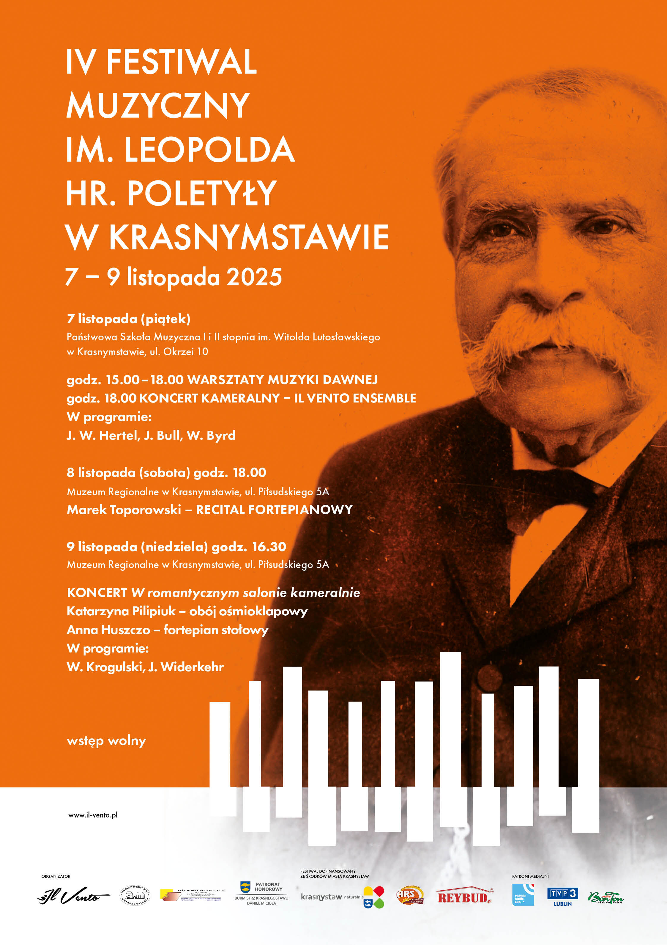 W dniach 7–9 listopada 2025 roku w Krasnymstawie odbędzie się czwarta edycja Festiwalu Muzycznego im. Leopolda hr. Poletyły. To wyjątkowe wydarzenie, które od kilku lat gromadzi miłośników muzyki klasycznej, zapraszając do udziału w koncertach, warsztatach oraz spotkaniach z muzyką dawną i romantyczną.