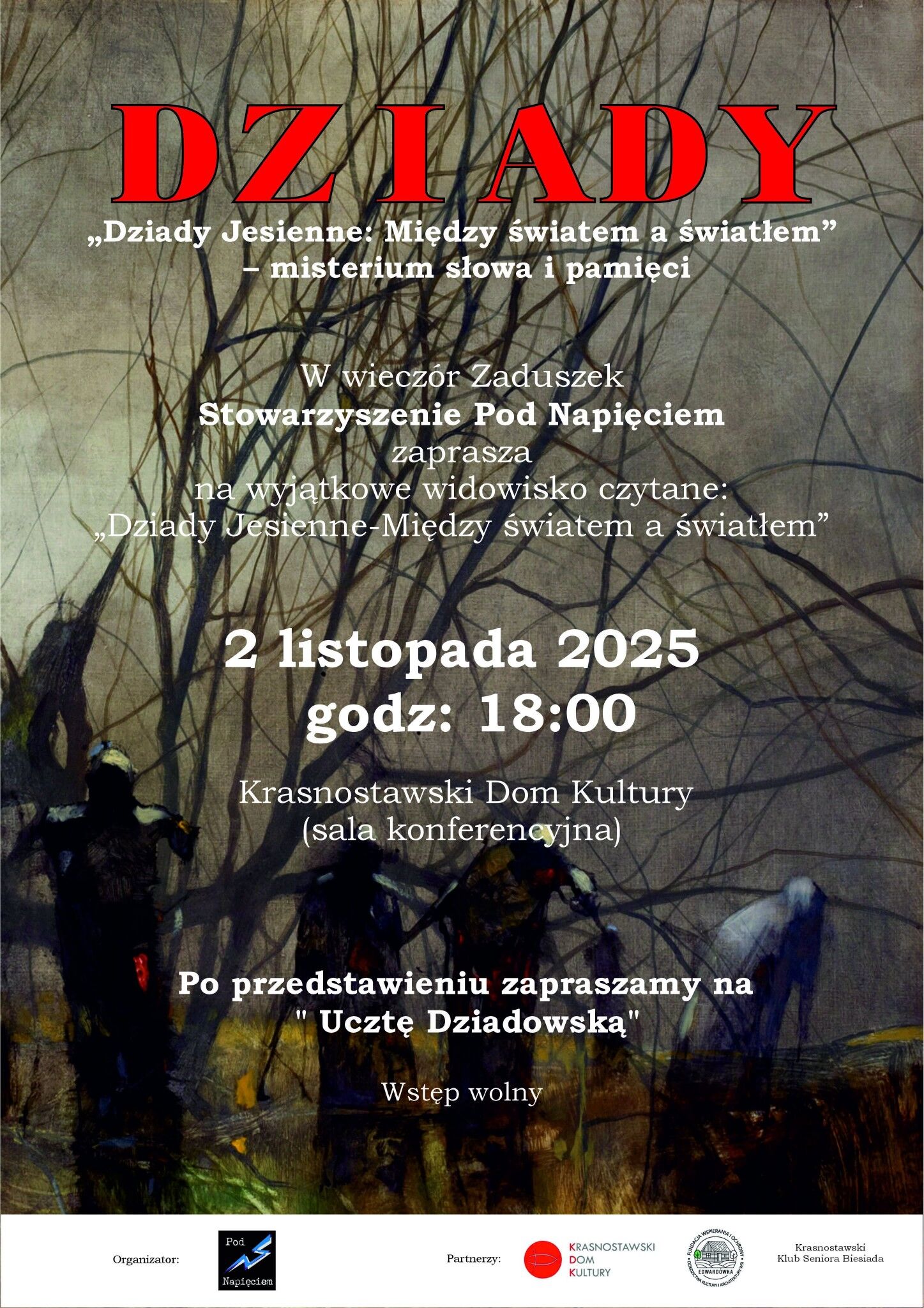 „Dziady Jesienne: Między światem a światłem” – współczesną interpretację dawnych obrzędów zadusznych, w której przenikają się świat słowiańskich wierzeń i chrześcijańskich tradycji pamięci o zmarłych.