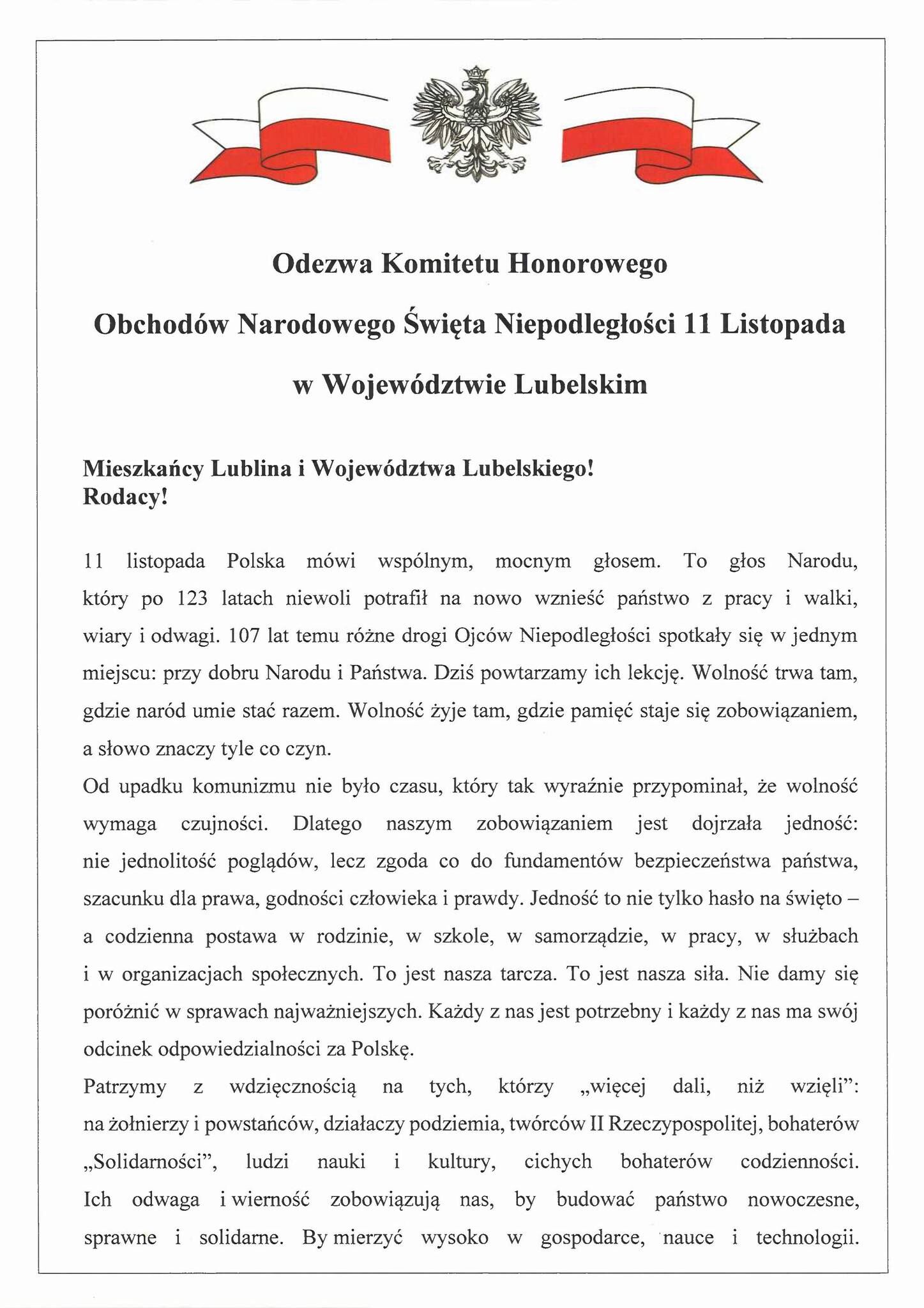 Z okazji zbliżających się obchodów Narodowego Święta Niepodległości publikujemy Odezwę Komitetu Honorowego Obchodów Narodowego Święta Niepodległości 11 Listopada w Województwie Lubelskim, wystosowaną przez Wojewodę Lubelskiego.