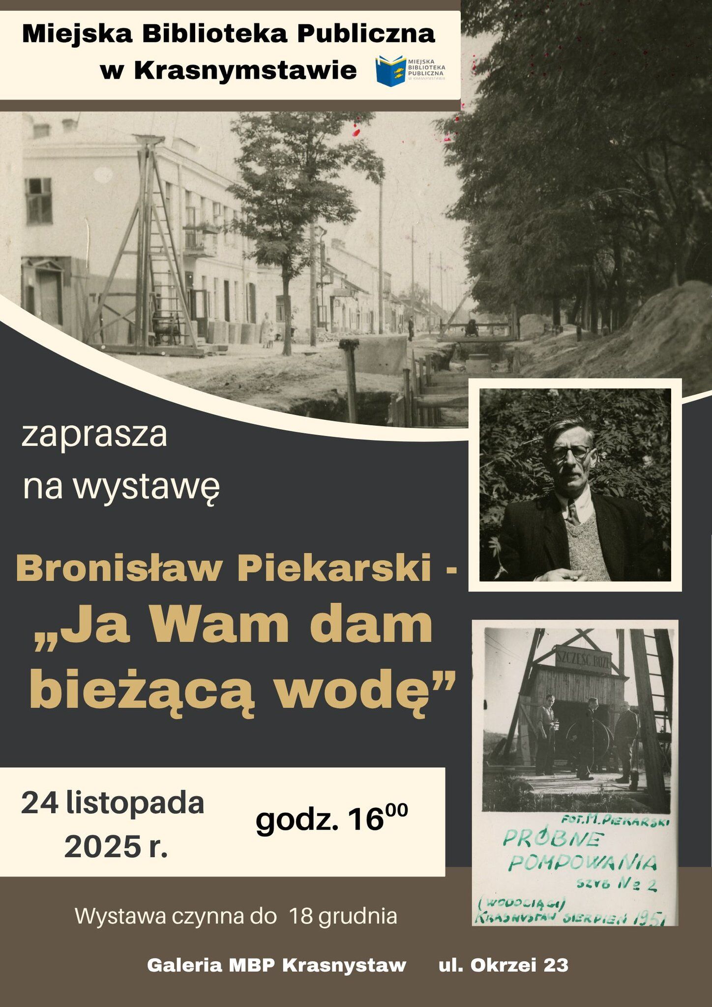 Miejska Biblioteka Publiczna w Krasnymstawie zaprasza na wernisaż wystawy poświęconej Bronisławowi Piekarskiemu, jednej z kluczowych postaci związanych z rozwojem lokalnej infrastruktury komunalnej. Ekspozycja pod tytułem „Bronisław Piekarski – Ja Wam dam bieżącą wodę” zostanie otwarta 24 listopada 2025 roku o godz. 16.00 w galerii biblioteki przy ul. Okrzei 23.