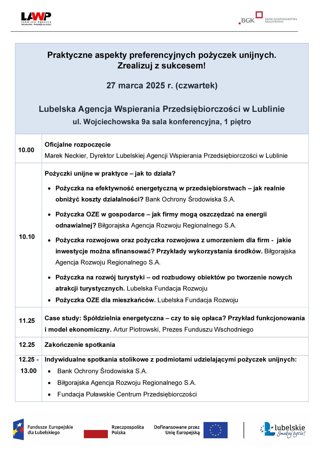 Rejestracja trwa do 25 marca. Zapisy na stronie: https://funduszeue.lubelskie.pl/lawp/spotkania-wydarzenia/praktyczne-aspekty-preferencyjnych-pozyczek-unijnych-zrealizuj-z-sukcesem/