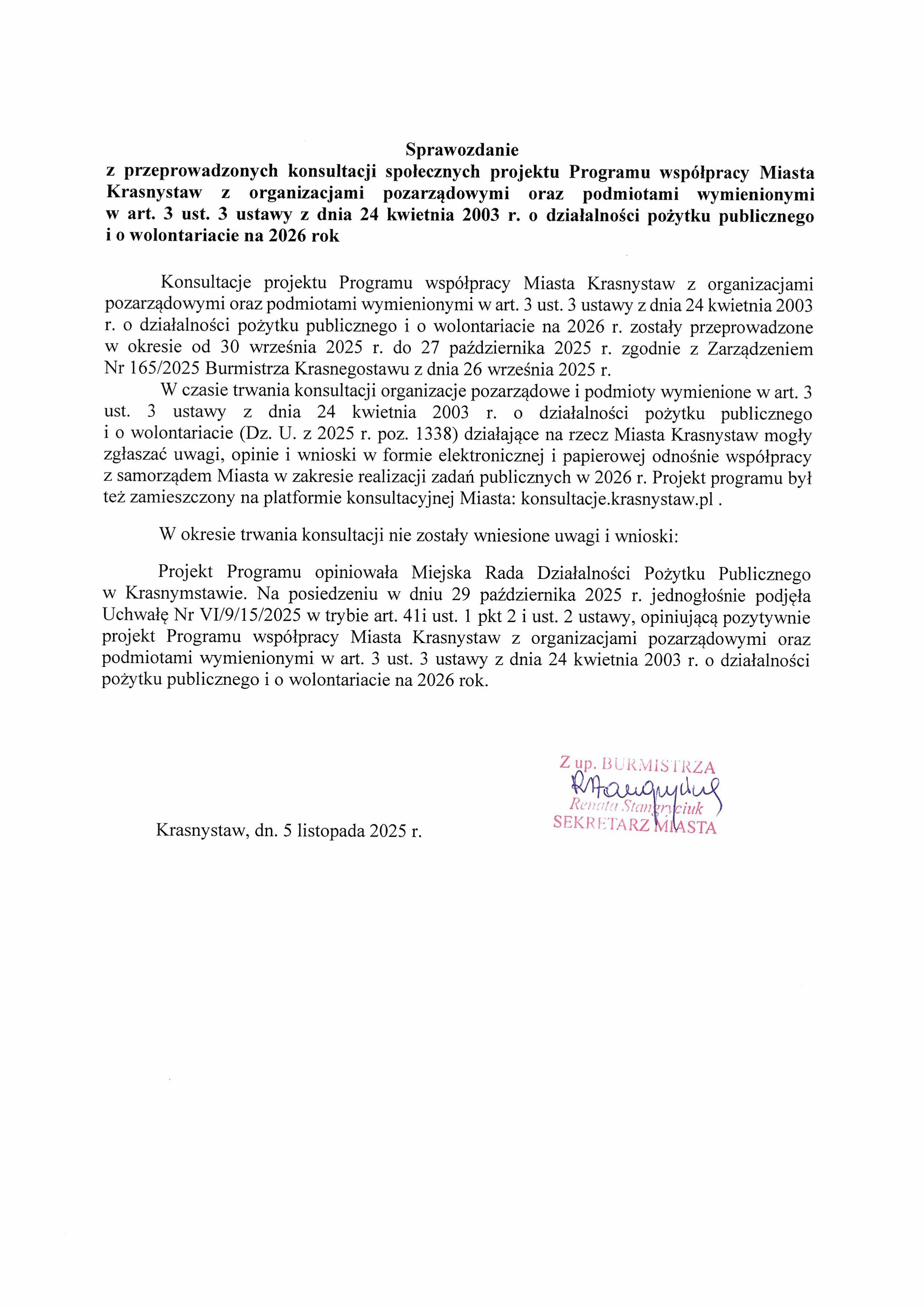 Miasto Krasnystaw przedstawia sprawozdanie z konsultacji społecznych dotyczących projektu Programu współpracy z organizacjami pozarządowymi na 2026 rok. Zachęcamy do zapoznania się z dokumentem podsumowującym przebieg konsultacji i opinię Miejskiej Rady Działalności Pożytku Publicznego.